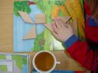 Beim Mosaikpuzzle stehen dem Kind mehrere verschiedene geometrische Formen aus Holz zur Verfügung. Diese sollen in eine vorgestanzte Form eingesetzt einen bildlich vorgegebenen Gegenstand ergeben, zum Beispiel ein Segelboot.