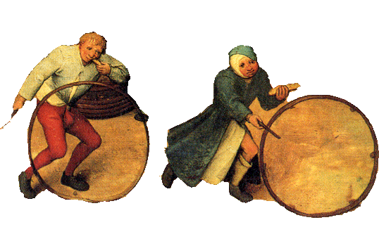 Zwei Jungen schlagen große Reifen. Jeder lenkt seinen Reifen mit einem in der rechten Hand gehaltenen Stock, während er ein Brötchen, das er gerade isst, in der linken Hand hält. Es ist wahrscheinlich, dass der Junge zur linken Seite seinen Reifen von dem Fass, das hinter ihm steht, abgenommen hat. (Hills, S.27) Das Reifentreiben ist schon auf antiken griechischen Vasenbildern wiedergegeben, und der elsässische Humanist Geiler von Kaysersberg singt schon zu Beginn des 16. Jahrhunderts ein Loblied auf dieses Spiel. (Mathys, S. 82) |