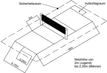 geteilt, so dass zwei Spielfelder von 8 x 6,10 m entstehen. In einer Entfernung